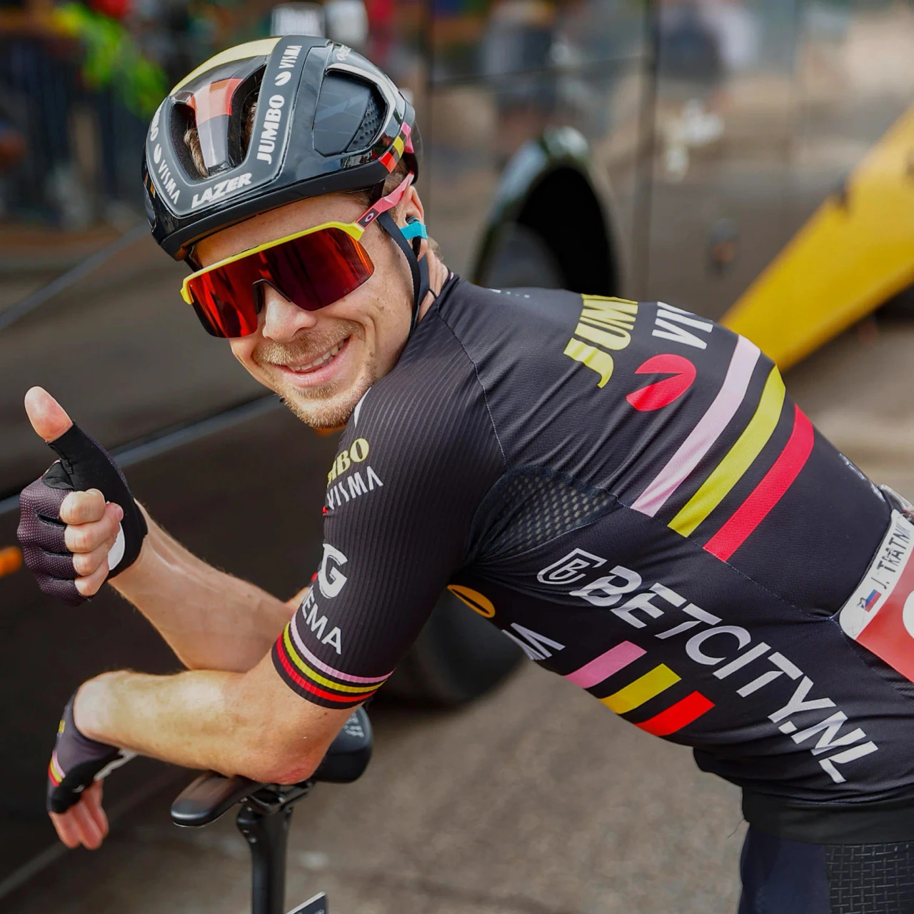 This is the cycling kit that Team Jumbo-Visma wore during the last stage of the Vuelta a España in 2023. This kit was used to celebrate Team Jumbo-Visma’s overall victories in the Giro d’Italia, Tour de France and Vuelta a España. The design of the kit features the trophies of the Giro, Tour and Vuelta. With this the team completed a trilogy; winning 3 Grand Tours in one year. Order this cycling kit as a souvenir of Team Jumbo-Visma’s best season ever!