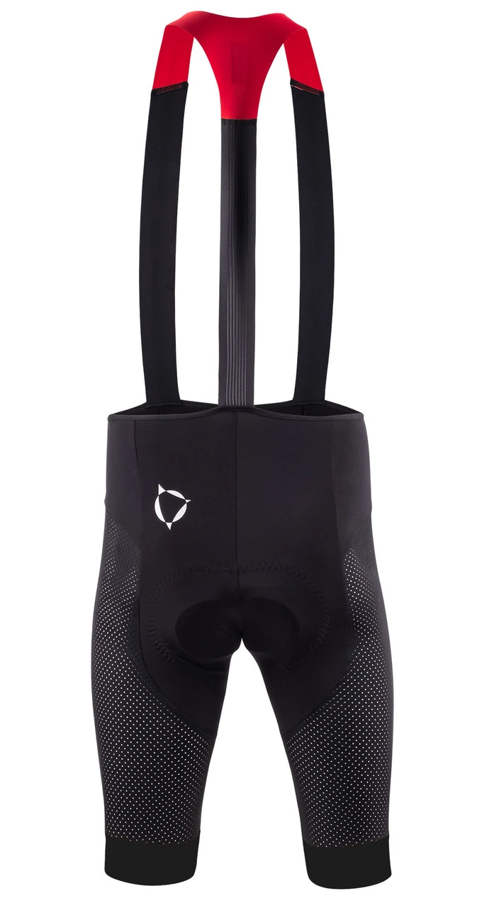 This ergonomic and light bibshort is conceived for the warmest days and the hardest climbs, for this reason it is also adapted for indoor use. Side panels in micro perforated sport-lycra, crotch area in anti-abrasion woven fabric. The upper part is minimal and consists of the two frontal braces and one single rear brace, all obtained from an elastic microfiber of special lightweight and soft touch, laser cut without stitching. A light and perforated elastic at legs’ hem keeps it in position on leg and gives a touch of modern color repeated on braces too.